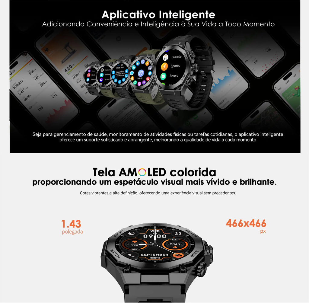 AM18 Smartwatch AURAFIT ENERGY 2 Masculino, 1.43" AMOLED, 150+ Modos Esportivos, Monitor Saúde relógio inteligente, Android/iOS