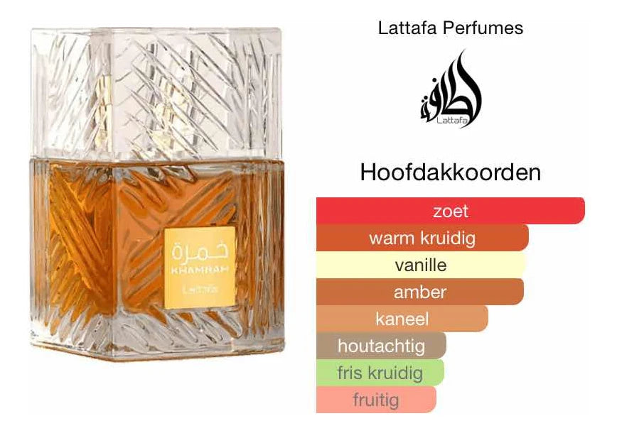 O Khamrah é uma fragrância intensa e envolvente, iniciando com um toque picante e amadeirado da canela e noz-moscada, equilibrado pela bergamota fresca. As notas de coração revelam uma suavidade gourmand, com fava tonka e praliné trazendo doçura, complementadas pela maçã e a cremosidade da tuberosa. O fundo é profundo e reconfortante, com baunilha, âmbar e almíscar, criando uma base envolvente e duradoura.